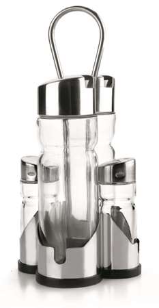Ménagère 3 pièces poivre, sel et moutarde en inox poli satiné et verre, couvercle à visser.