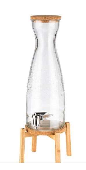 Récipient avec robinet en acier inox et couvercle de liège, verre robuste, incl.pied en bois et soucoupes de liège.