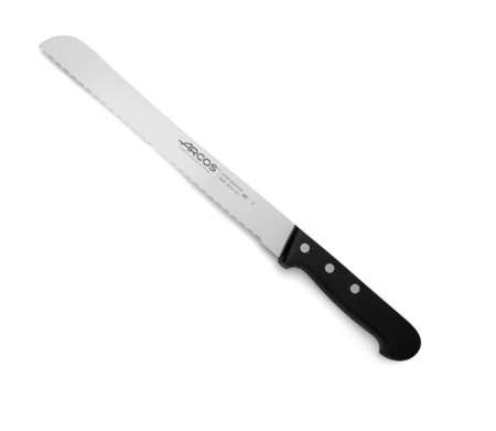 Couteau à génoise de 35 cm avec un manche ABS 3 rivets. Avec des dents moins profondes (crantage demi-lune) qu'un couteau à pain, il permet de découper des produits fragiles tels que génoises, brioches, entremets, pains de mie.