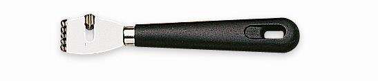 Décozest® gaucher - zesteur/canneleur - affûté - manche plastique noir à virole. Le Décozest est un outil culinaire polyvalent. Son premier tranchant en forme de V permet de réaliser des lanières de légumes ou de fruits, de décorer une pièce travaillée. Son deuxième tranchant muni de petits trous affutés permet de réaliser des zestes.