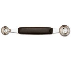 Moule à pomme double - diamètres 22 et 28 mm - affûté - manche plastique noir à virole. La cuillère à pomme, également appelée moule à pomme, pomme parisienne ou cuillère à melon, permet de créer de petites billes ou boules de légumes ou de fruits.
