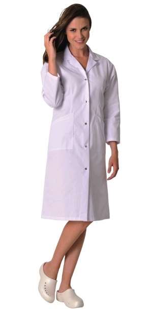 Polyester - coton Col tailleur, Manches longues montées, Pinces devant et au dos, 2 poches basses plaquées, Fermeture centrale par pressions, Longueur : 105 cm Coloris blanc Taille 5 Polycoton